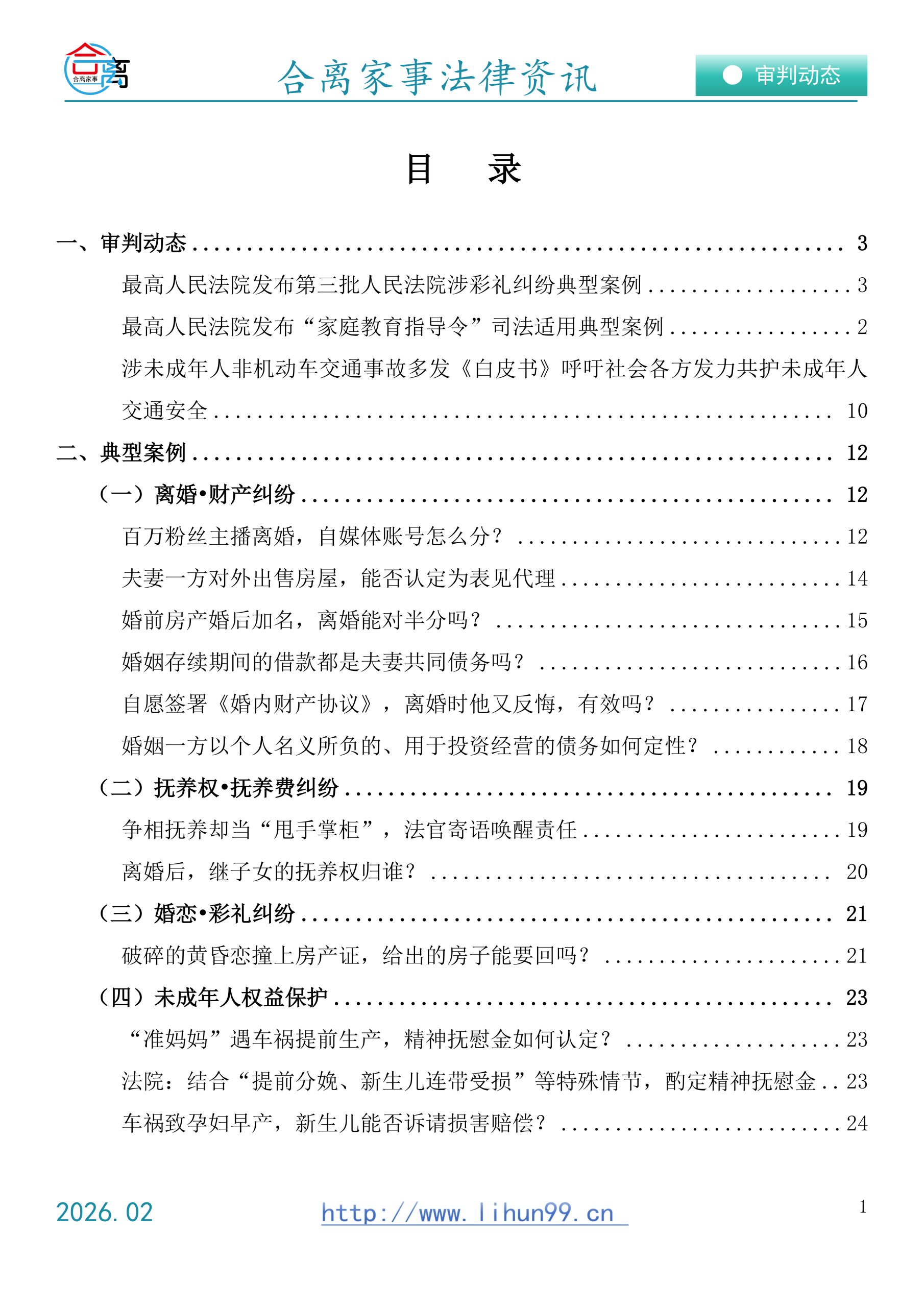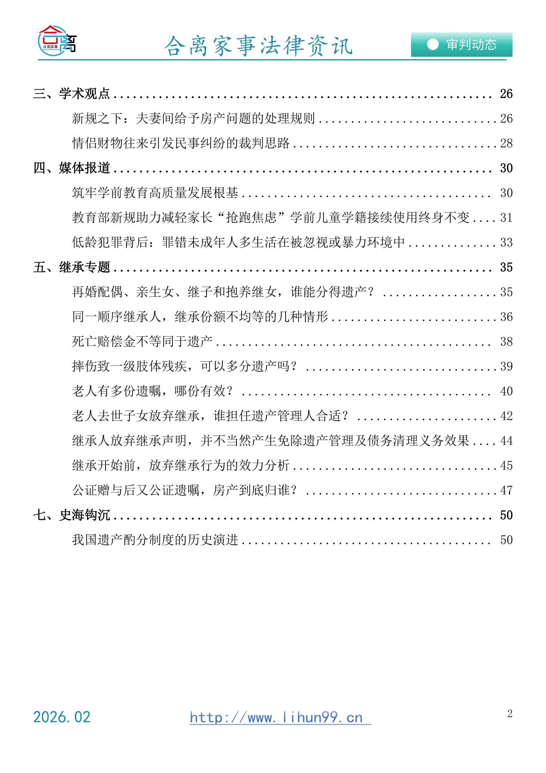 合离家事2026年第2期,关于婚姻·家庭·继承的法律资讯合集合离家事法律资讯2026.02(免费赠阅)水印!以下是本期目录,欢迎下载探讨。