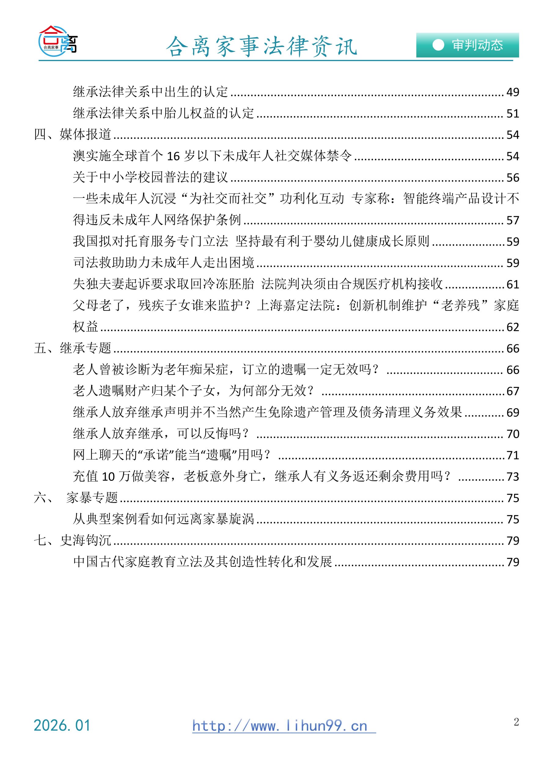合离家事2026年第1期,关于婚姻·家庭·继承的法律资讯合集合离家事法律资讯2026.01(免费赠阅)水印!以下是本期目录,欢迎下载探讨。